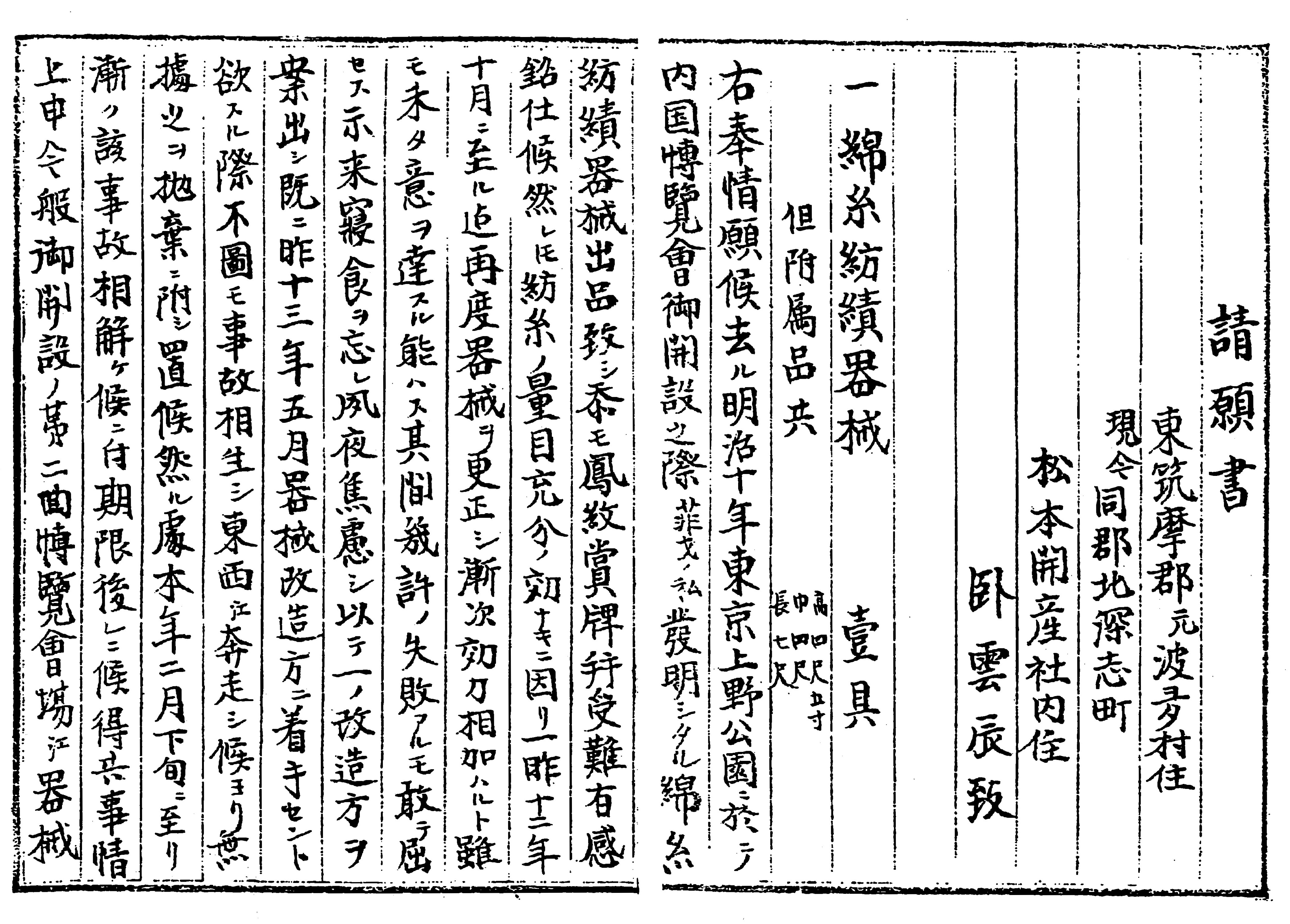 一、去ル明治十年博覧会之際出品致候器械ハ糸口百口ニテ一時間ニ漸ク紡糸六拾目ヲ製出シ而テ其糸粗漏ナリ今回改良之器械ハ前條陳ルカ如ク一時間二百ノ多量ヲ製出スルノミナラス該糸上等ナリ旁々以勧業ノ為メ期限遅レニハ候得共出品致度候何卒特典之御詮議ヲ以テ本願御允許被成度器械窵一葉相添ヘ此段只願奉請候以上