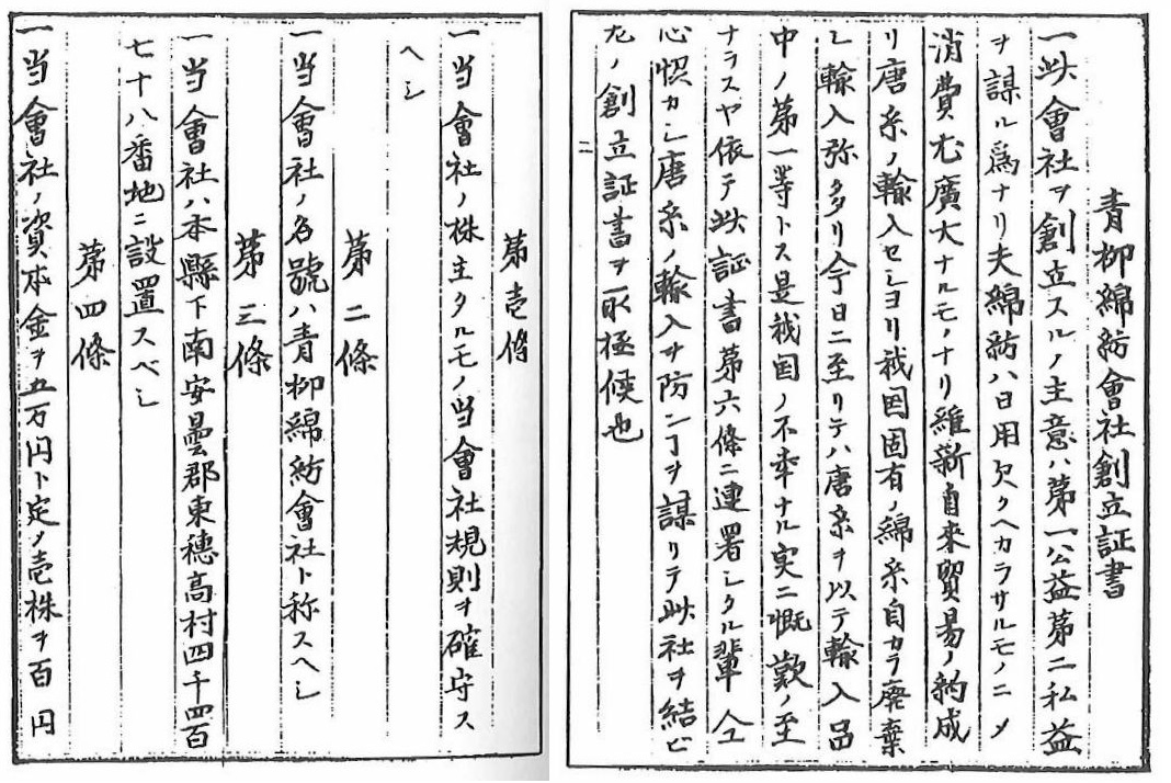 青柳棉紡会社創立証書