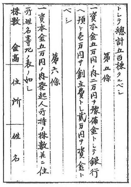 このように辰致と青柳庫蔵は資本金5万円(現在の価値15億円~20億円)、発行株数500株の株式会社設立を目指すが、目標の資本金がきわめて多額のためか、結局この会社は設立されなかった。
