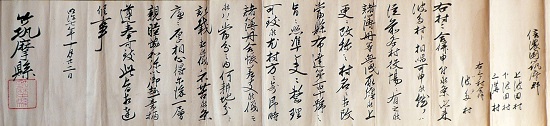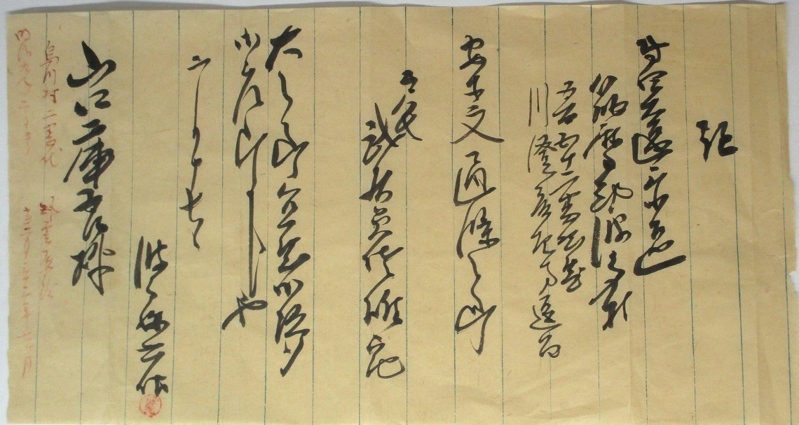 『この資料は、臥雲が既に波多村川澄藤左さんのところに逗留しているので、波多村副戸長の波多腰六左が、烏川村の山口庫吾に逗留の手続きを、案文(最初の四行)の通り、波多村戸長のお武居美佐雄宛にして欲しいという依頼文でしょう。当時、臥雲は川澄家に逗留し、波多腰六左・武居美佐雄などの人びとと、既に発明にかかわる取り組みをしていたことを示す資料です。』