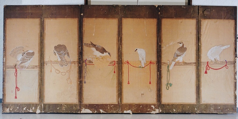 波田地区下原の水沢千秋さんは、先祖が若澤寺の僧侶であったと いわれ、現在お宅には、伝えられた二双の古い屏風があります。 八曲の屏風には中国の風物が描かれ、六曲の屏風の方には六羽の鷹の絵が描かれています。 他に水沢家には密教仏具の「独鈷・三具」なども所持しています。